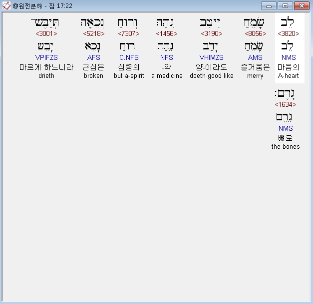 히브리어구약BHS,22 לֵב שָׂמֵחַ יֵיטִב גֵּהָה וְרוּחַ נְכֵאָה תְּיַבֶּשׁ־גָּרֶם׃