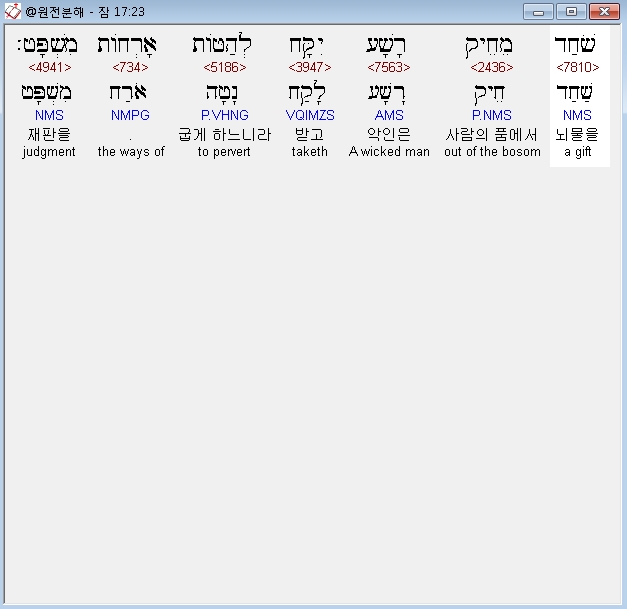 히브리어구약BHS,23 שֹׁחַד מֵחֵיק רָשָׁע יִקָּח לְהַטֹּות אָרְחֹות מִשְׁפָּט׃