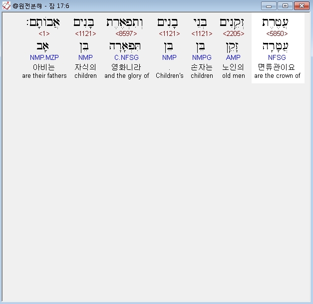 히브리어구약BHS,6 עֲטֶרֶת זְקֵנִים בְּנֵי בָנִים וְתִפְאֶרֶת בָּנִים אֲבֹותָם׃
