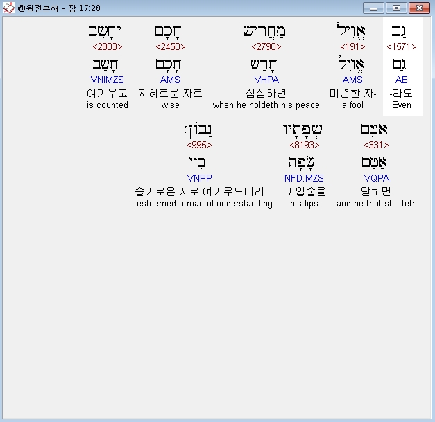 히브리어구약BHS,28 גַּם אֱוִיל מַחֲרִישׁ חָכָם יֵחָשֵׁב אֹטֵם שְׂפָתָיו נָבֹון׃