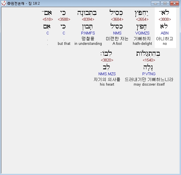 히브리어구약BHS,2 לֹא־יַחְפֹּץ כְּסִיל בִּתְבוּנָה כִּי אִם־בְּהִתְגַּלֹּות לִבֹּו׃