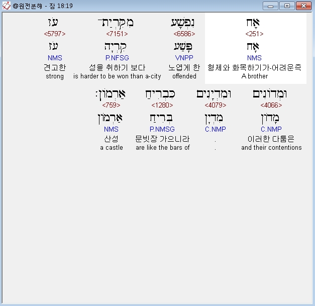 노엽게 한 형제와 ... 이러한 다툼은 산성 문빗장 같으니라 - 본절의 '다툼'(*, 미드와님)은 앞절의 '다툼'과 동일한 것으로 법정 소송을 의미한다. 이것은 형제 사이의 불화로 인해 샹겨난 반목으로 법정 소송까지 이르렀음을 시사한다. 이는 앞절에서 언급된 바 다툼의 해결을 통해서 성취된 화목과 극명하게 대조를 이루어 화목의 중요성을 강조한다. 이렇듯 친밀한 형제 사이에서 법정으로 갈 정도까지 심각하게 형성된 반목은 마치 견고한 성이나 산성 문빗장과 같아서 화목하기가 매우 어렵다.