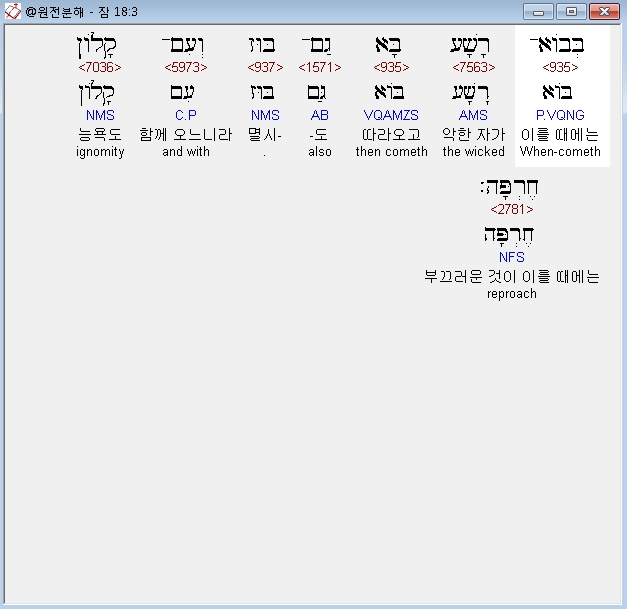 히브리어구약BHS,3 בְּבֹוא־רָשָׁע בָּא גַם־בּוּז וְעִם־קָלֹון חֶרְפָּה׃