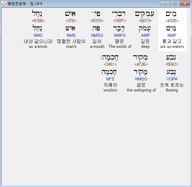 히브리어구약BHS,4 מַיִם עֲמֻקִּים דִּבְרֵי פִי־אִישׁ נַחַל נֹבֵעַ מְקֹור חָכְמָה׃