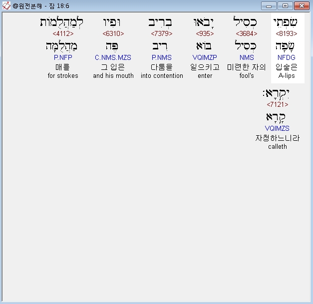히브리어구약BHS,6 שִׂפְתֵי כְסִיל יָבֹאוּ בְרִיב וּפִיו לְמַהֲלֻמֹות יִקְרָא׃