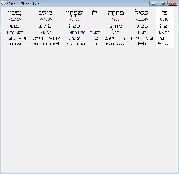 히브리어구약BHS,7 פִּי־כְסִיל מְחִתָּה־לֹו וּשְׂפָתָיו מֹוקֵשׁ נַפְשֹׁו׃