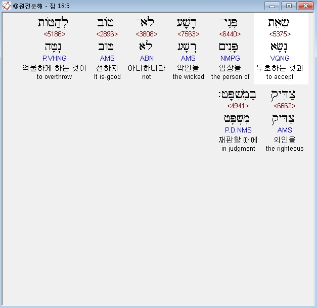히브리어구약BHS,5 שְׂאֵת פְּנֵי־רָשָׁע לֹא־טֹוב לְהַטֹּות צַדִּיק בַּמִּשְׁפָּט׃