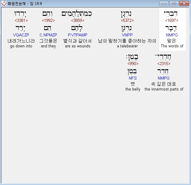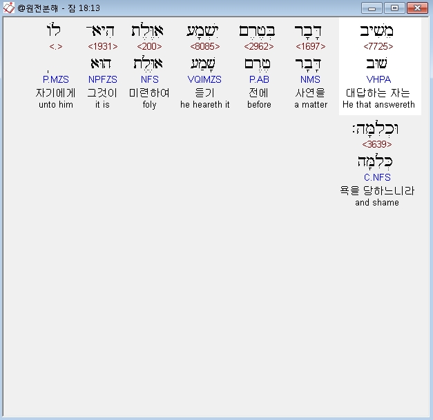 | 히브리어 잠언 19장 전체 원어 원문 성경 공부 주석 강해 설교 해설 해석 (0) | 2020.10.15 |