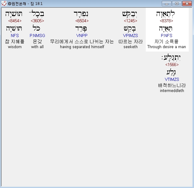 히브리어구약BHS,1 לְתַאֲוָה יְבַקֵּשׁ נִפְרָד בְּכָל־תּוּשִׁיָּה יִתְגַּלָּע׃