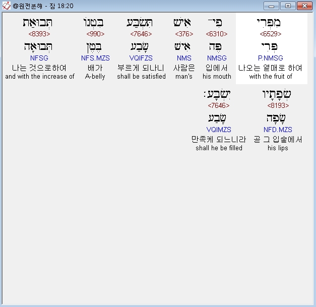 히브리어구약BHS,20 מִפְּרִי פִי־אִישׁ תִּשְׂבַּע בִּטְנֹו תְּבוּאַת שְׂפָתָיו יִשְׂבָּע׃