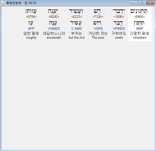 히브리어구약BHS,23 תַּחֲנוּנִים יְדַבֶּר־רָשׁ וְעָשִׁיר יַעֲנֶה עַזֹּות׃