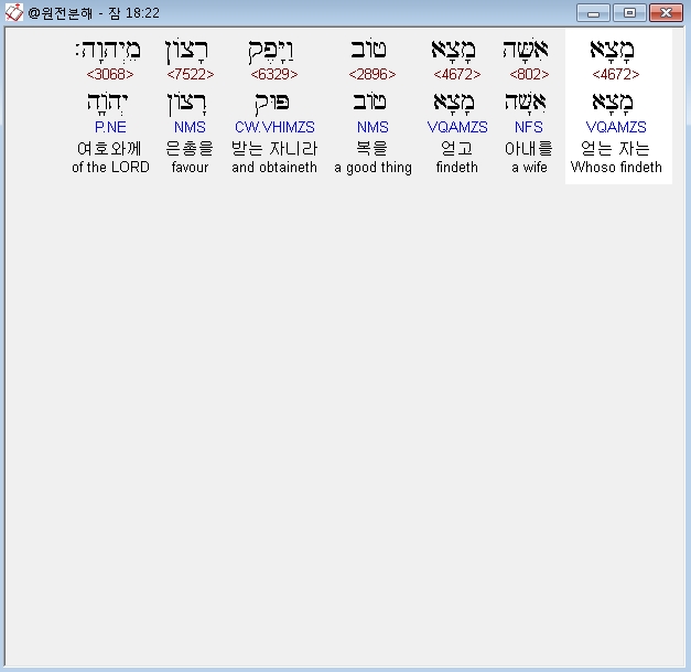 히브리어구약BHS,22 מָצָא אִשָּׁה מָצָא טֹוב וַיָּפֶק רָצֹון מֵיְהוָה׃