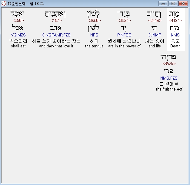 히브리어구약BHS,21 מָוֶת וְחַיִּים בְּיַד־לָשֹׁון וְאֹהֲבֶיהָ יֹאכַל פִּרְיָהּ׃