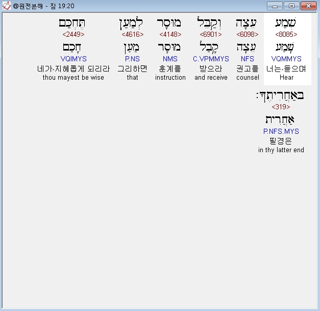 | 히브리어 잠언 20장 전체 원어 원문 성경 공부 주석 강해 설교 해설 해석 (0) | 2020.10.15 |