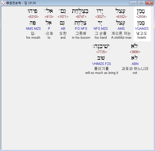 히브리어구약BHS,24 טָמַן עָצֵל יָדֹו בַּצַּלָּחַת גַּם־אֶל־פִּיהוּ לֹא יְשִׁיבֶנָּה׃