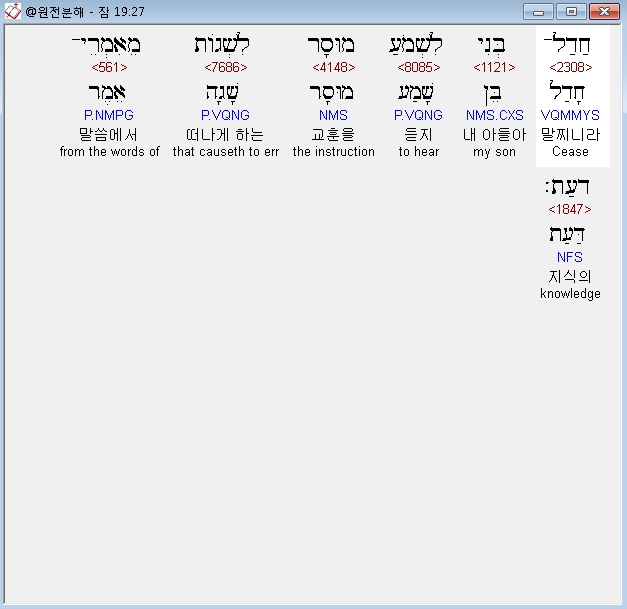 히브리어구약BHS,27 חַדַל־בְּנִי לִשְׁמֹעַ מוּסָר לִשְׁגֹות מֵאִמְרֵי־דָעַת׃