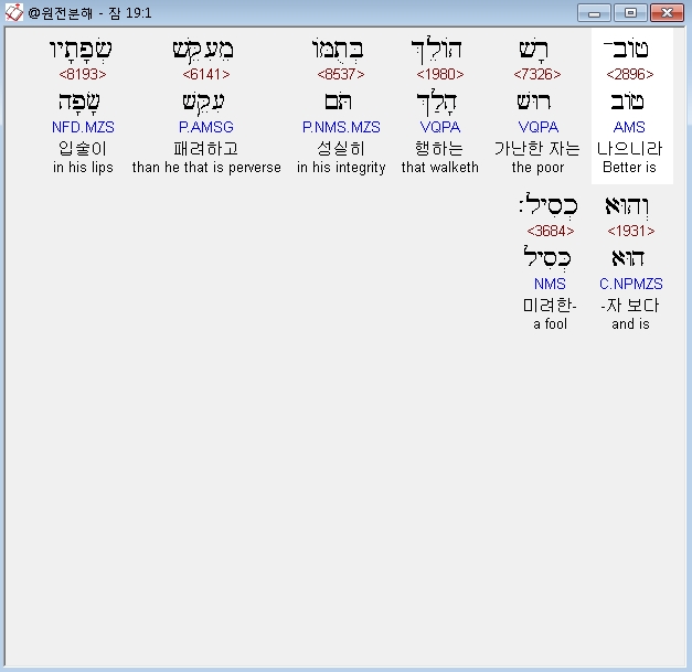 히브리어구약BHS,1 טֹוב־רָשׁ הֹולֵךְ בְּתֻמֹּו מֵעִקֵּשׁ שְׂפָתָיו וְהוּא כְסִיל׃