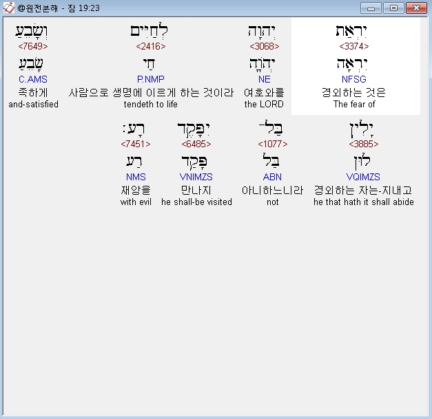 히브리어구약BHS,23 יִרְאַת יְהוָה לְחַיִּים וְשָׂבֵעַ יָלִין בַּל־יִפָּקֶד רָע׃