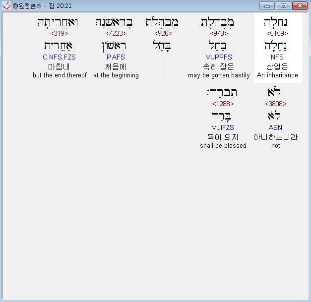 | 히브리어 잠언 21장 전체 원어 원문 성경 공부 주석 강해 설교 해설 해석 (0) | 2020.10.15 |