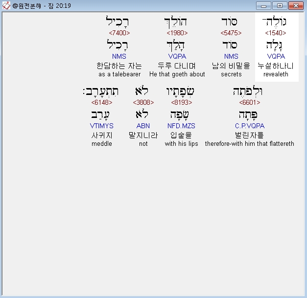 | 히브리어 잠언 19장 전체 원어 원문 성경 공부 주석 강해 설교 해설 해석 (0) | 2020.10.15 |