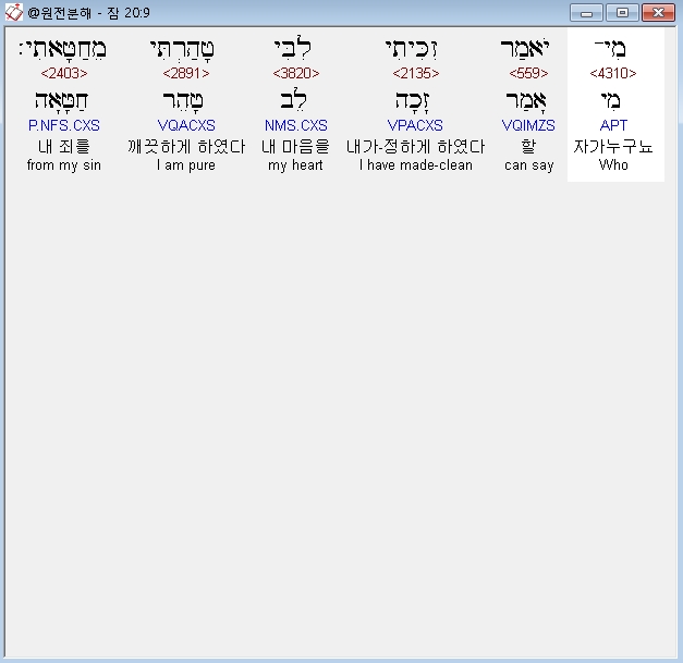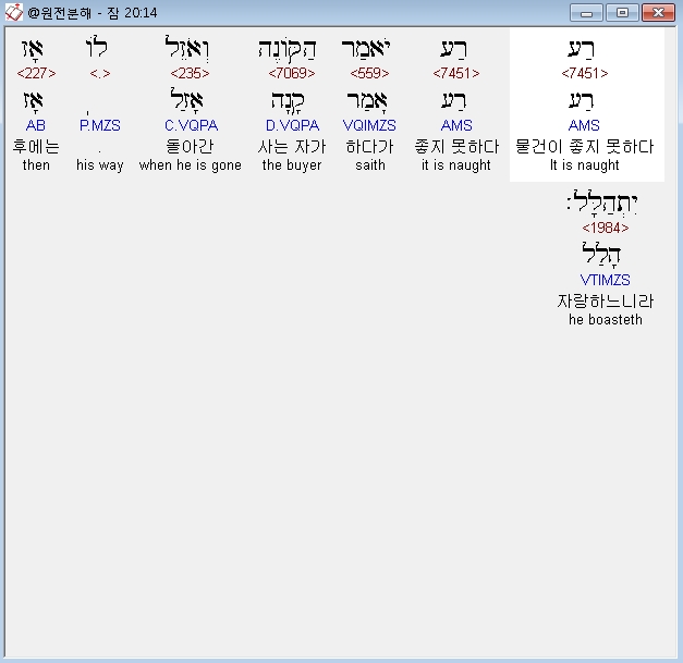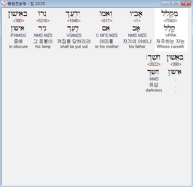| 히브리어 잠언 22장 전체 원어 원문 성경 공부 주석 강해 설교 해설 해석 (0) | 2020.10.15 |