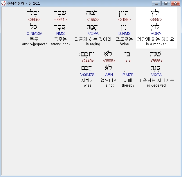 히브리어구약BHS,1 לֵץ הַיַּיִן הֹמֶה שֵׁכָר וְכָל־שֹׁגֶה בֹּו לֹא יֶחְכָּם׃