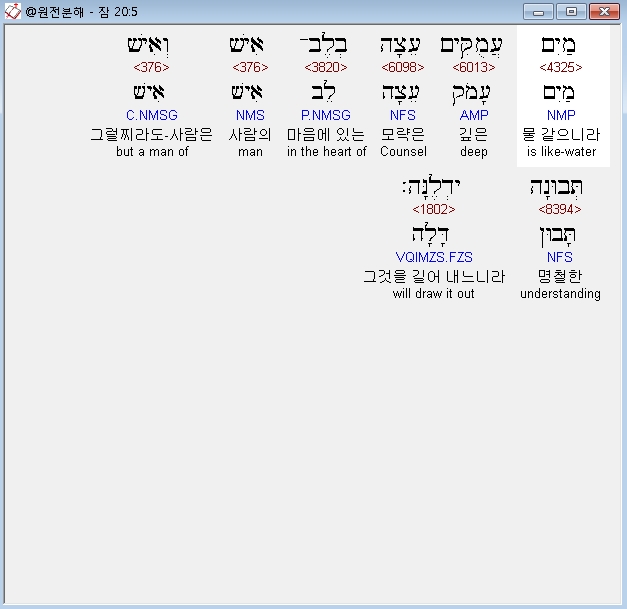 히브리어구약BHS,5 מַיִם עֲמֻקִּים עֵצָה בְלֶב־אִישׁ וְאִישׁ תְּבוּנָה יִדְלֶנָּה׃