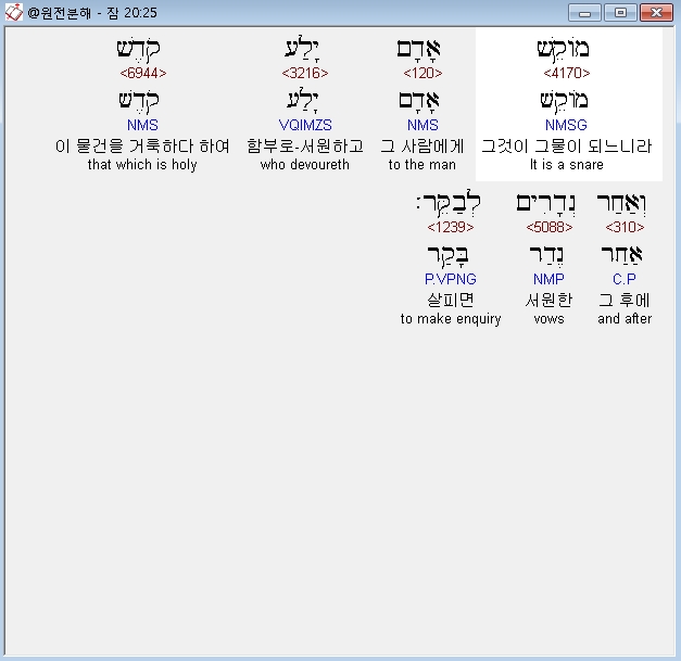 히브리어구약BHS,25 מֹוקֵשׁ אָדָם יָלַע קֹדֶשׁ וְאַחַר נְדָרִים לְבַקֵּר׃