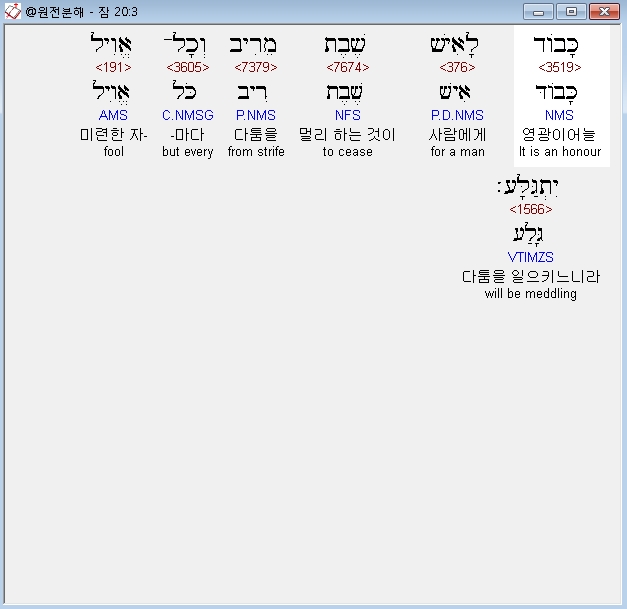 히브리어구약BHS,3 כָּבֹוד לָאִישׁ שֶׁבֶת מֵרִיב וְכָל־אֱוִיל יִתְגַּלָּע׃