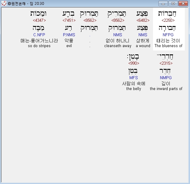 개역개정,30 상하게 때리는 것이 악을 없이하나니 매는 사람 속에 깊이 들어가느니라