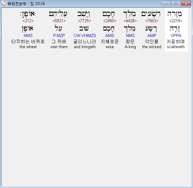 히브리어구약BHS,26 מְזָרֶה רְשָׁעִים מֶלֶךְ חָכָם וַיָּשֶׁב עֲלֵיהֶם אֹופָן׃