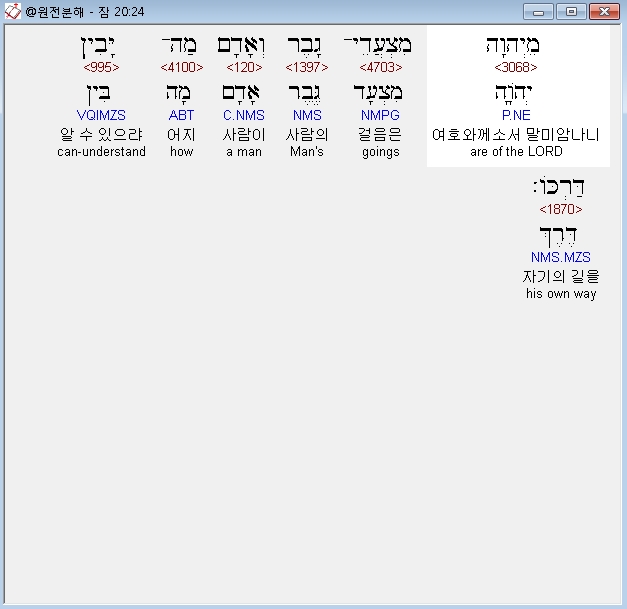 히브리어구약BHS,24 מֵיְהוָה מִצְעֲדֵי־גָבֶר וְאָדָם מַה־יָּבִין דַּרְכֹּו׃