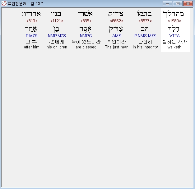 히브리어구약BHS,7 מִתְהַלֵּךְ בְּתֻמֹּו צַדִּיק אַשְׁרֵי בָנָיו אַחֲרָיו׃