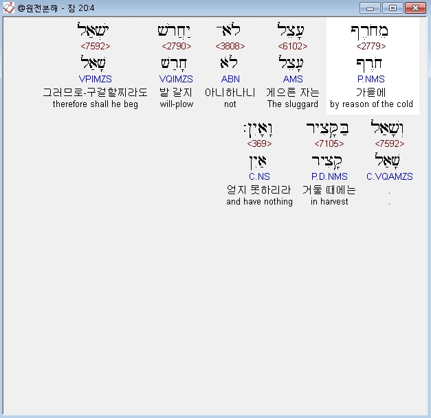 히브리어구약BHS,4 מֵחֹרֶף עָצֵל לֹא־יַחֲרֹשׁ [כ= יִשְׁאַל] [ק= וְשָׁאַל] בַּקָּצִיר וָאָיִן׃