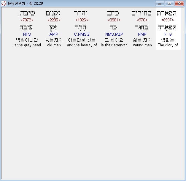히브리어구약BHS,29 תִּפְאֶרֶת בַּחוּרִים כֹּחָם וַהֲדַר זְקֵנִים שֵׂיבָה׃