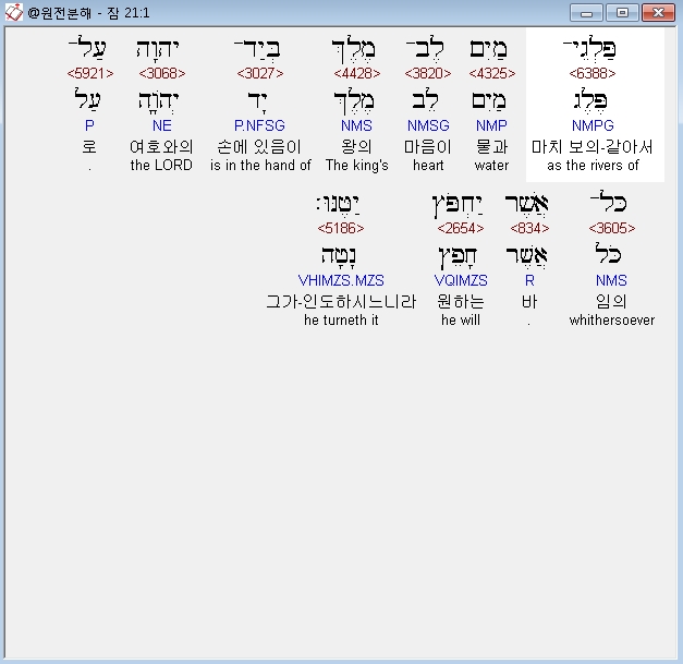히브리어구약BHS,1 פַּלְגֵי־מַיִם לֶב־מֶלֶךְ בְּיַד־יְהוָה עַל־כָּל־אֲשֶׁר יַחְפֹּץ יַטֶּנּוּ׃
