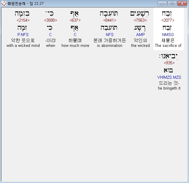 히브리어구약BHS,27 זֶבַח רְשָׁעִים תֹּועֵבָה אַף כִּי־בְזִמָּה יְבִיאֶנּוּ׃
