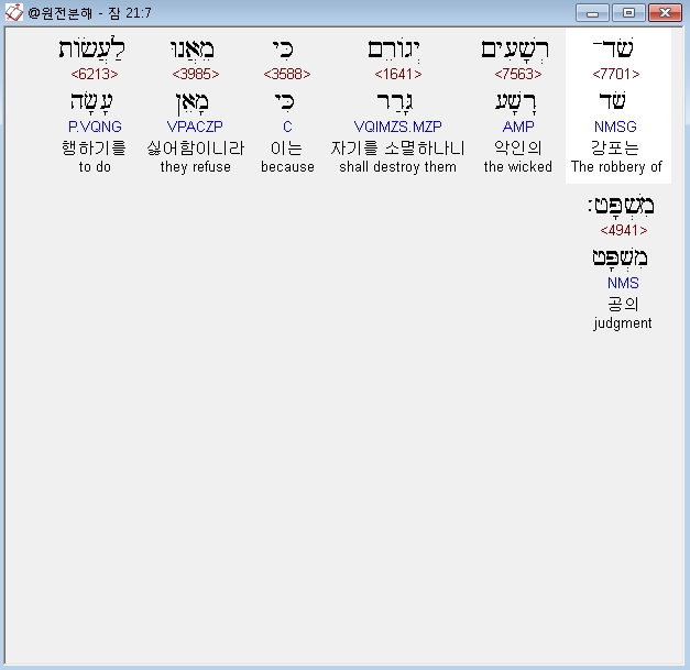 히브리어구약BHS,7 שֹׁד־רְשָׁעִים יְגֹורֵם כִּי מֵאֲנוּ לַעֲשֹׂות מִשְׁפָּט׃