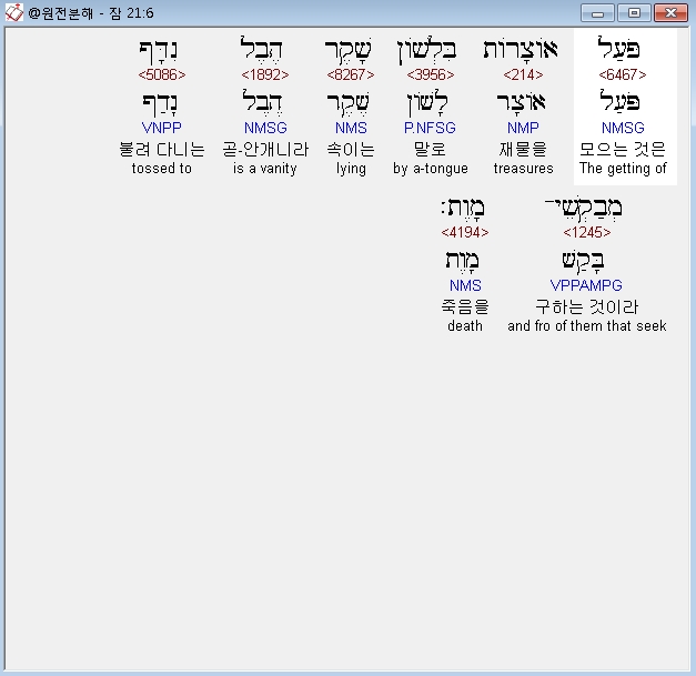 히브리어구약BHS,6 פֹּעַל אֹוצָרֹות בִּלְשֹׁון שָׁקֶר הֶבֶל נִדָּף מְבַקְשֵׁי־מָוֶת׃