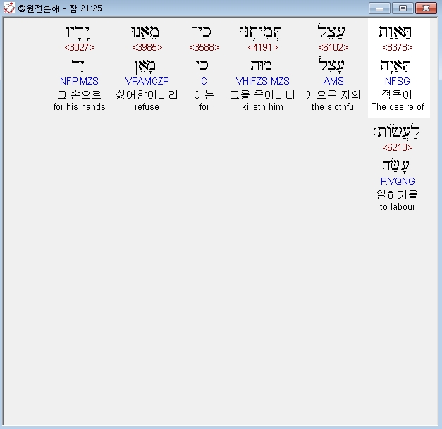 히브리어구약BHS,25 תַּאֲוַת עָצֵל תְּמִיתֶנּוּ כִּי־מֵאֲנוּ יָדָיו לַעֲשֹׂות׃