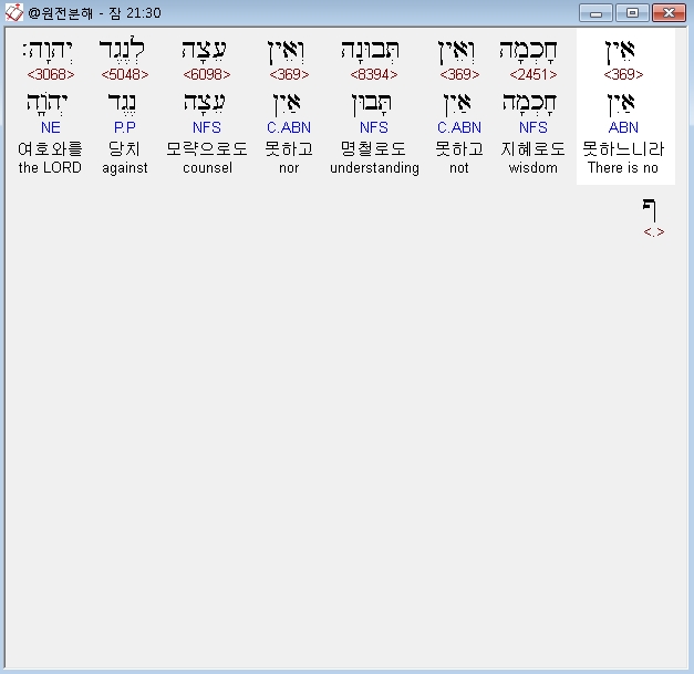 히브리어구약BHS,30 אֵין חָכְמָה וְאֵין תְּבוּנָה וְאֵין עֵצָה לְנֶגֶד יְהוָה׃ ף