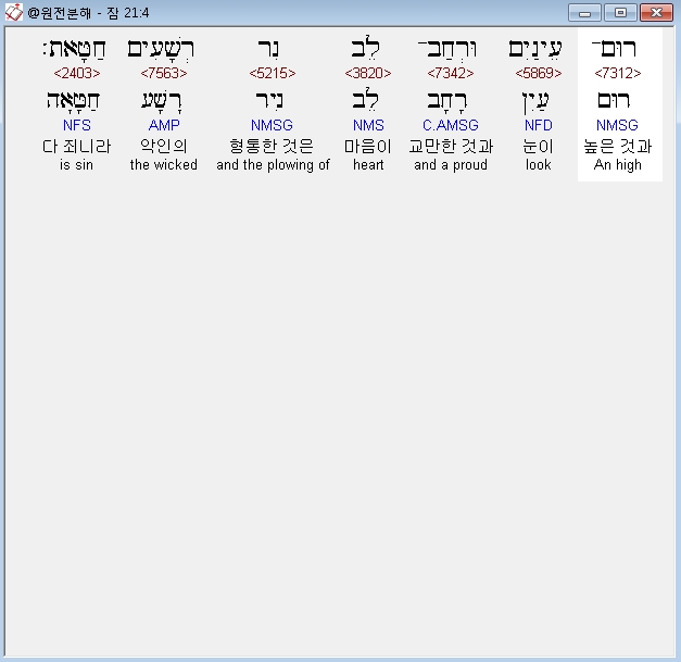 히브리어구약BHS,4 רוּם־עֵינַיִם וּרְחַב־לֵב נִר רְשָׁעִים חַטָּאת׃