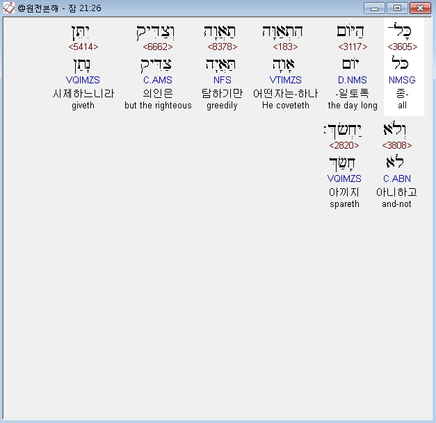 히브리어구약BHS,26 כָּל־הַיֹּום הִתְאַוָּה תַאֲוָה וְצַדִּיק יִתֵּן וְלֹא יַחְשֹׂךְ׃