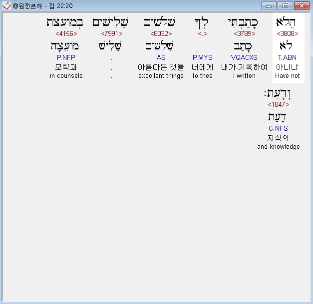 | 히브리어 잠언 20장 전체 원어 원문 성경 공부 주석 강해 설교 해설 해석 (0) | 2020.10.15 |