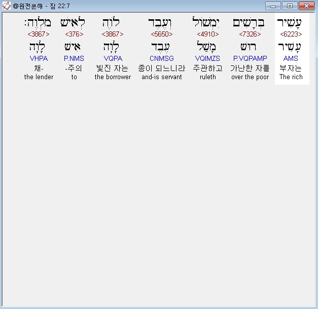 히브리어구약BHS,7 עָשִׁיר בְּרָשִׁים יִמְשֹׁול וְעֶבֶד לֹוֶה לְאִישׁ מַלְוֶה׃
