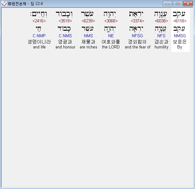 히브리어구약BHS,4 עֵקֶב עֲנָוָה יִרְאַת יְהוָה עֹשֶׁר וְכָבֹוד וְחַיִּים׃