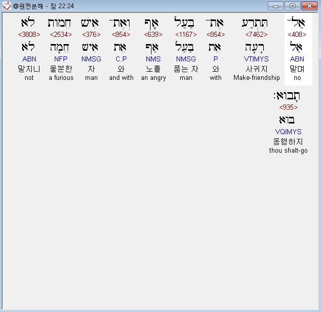 히브리어구약BHS,24 אַל־תִּתְרַע אֶת־בַּעַל אָף וְאֶת־אִישׁ חֵמֹות לֹא תָבֹוא׃