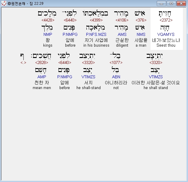 히브리어구약BHS,29 חָזִיתָ אִישׁ מָהִיר בִּמְלַאכְתֹּו לִפְנֵי־מְלָכִים יִתְיַצָּב בַּל־יִתְיַצֵּב לִפְנֵי חֲשֻׁכִּים׃ ף