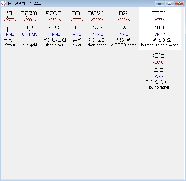히브리어구약BHS,1 נִבְחָר שֵׁם מֵעֹשֶׁר רָב מִכֶּסֶף וּמִזָּהָב חֵן טֹוב׃