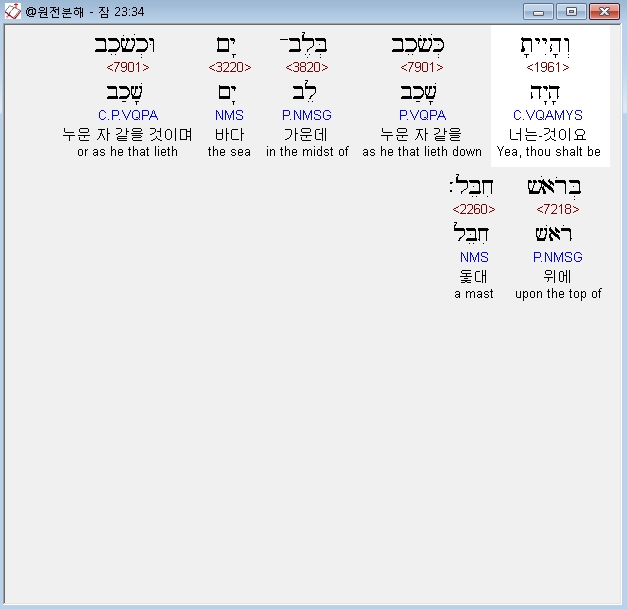 히브리어구약BHS,34 וְהָיִיתָ כְּשֹׁכֵב בְּלֶב־יָם וּכְשֹׁכֵב בְּרֹאשׁ חִבֵּל׃